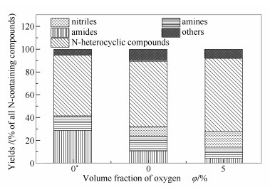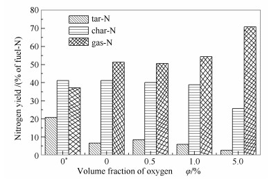 氧气的引入进一步降低了焦油与焦炭的产率,并降低了焦油与焦炭中氮的分配比,增加了小分子气体中氮的分配比。