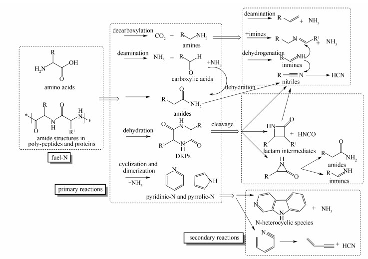 基于对焦油中含氮化合物种类与含量的分析,研究提出了热解过程中燃料氮转化的反应路径。以蛋白质和氨基酸为燃料氮的禀赋形态,其在热解过程中首先发生一系列一次反应,生成酰胺、胺类等初级焦油产物。初级焦油发生二次反应,进一步生成腈类及含氮杂环化合物等二级焦油产物。