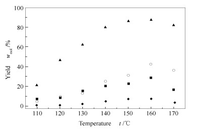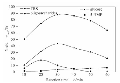 以[C4mim]ReO4为催化剂,在160 ℃降解微晶纤维素,考察反应时间对纤维素降解产物分布的影响,结果见图 2。由图 2可知,当反应进行至10 min时,纤维素仅部分降解,TRS约为45%,葡萄糖、低聚糖和5-HMF收率均较低。这是由于此时纤维素虽已开始进行降解反应,但由于反应时间过短,纤维素并不能充分降解转化为葡萄糖等小分子化合物。当反应时间继续延长时,随着纤维素降解反应深度的增加,TRS、葡萄糖收率、低聚糖收率和5-HMF收率均有所增加,低聚糖收率在20 min时达到最高值;而当反应时间延长至30 min时,随着低聚糖分子间糖苷键的断裂,逐渐转化为葡萄糖,其产率由18.2%下降至10.1%,而此时葡萄糖增加至最高收率43.2%。反应时间超过30 min以后,反应过程中生成的葡萄糖和低聚糖继续进行异构化和脱水反应,逐渐转化为5-HMF等其他降解产物,导致TRS、葡萄糖和低聚糖收率持续下降。5-HMF收率随着反应时间的延长而增加,但由于5-HMF化学性质不稳定,在较高温度条件下会继续进行缩合、水解甚至碳化反应,反应40 min以后,分析结果显示降解产物中有少量的乙酰丙酸和甲酸生成,因此,5-HMF收率并没有随反应时间的延长显著提高。同时,实验过程中发现,当反应温度过高或反应时间过长时,反应液颜色加深,稀释过滤后发现有黑色沉淀出现,该现象表明,由于纤维素降解反应深度过大,反应过程中有可溶于水或不溶于水的缩合产物胡敏素生成。