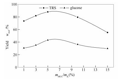 取不同用量的微晶纤维素溶解于2.0 g离子液体[Amim]Cl,以[C4mim]ReO4为催化剂在160 ℃降解30 min,考察反应物浓度对纤维素降解反应的影响,结果见图 3。由图 3可知,当纤维素在离子液体中浓度较小时,反应速率较低,不利于反应的进行和葡萄糖及低聚糖的生成,TRS和葡萄糖收率均较低。但纤维素浓度过高时,反应体系黏度增加,使催化剂不能与纤维素分子充分接触,不利于催化剂和纤维素分子的作用,TRS和葡萄糖收率反而下降[19]。当微晶纤维素质量为离子液体质量的5%时,TRS和葡萄糖收率最高。