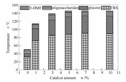 以[C4mim]ReO4为催化剂降解MCC,在160 ℃条件下反应30 min,考察催化剂用量对纤维素降解效果的影响(催化剂用量以纤维素物质的量为基准进行计算),结果见图 4。由图 4可以看出,当催化剂用量从0增加至5%时,TRS、低聚糖、葡萄糖和5-HMF产率均随着催化剂用量的增加而增加,这是由于催化剂用量增加,反应体系中催化剂活性中心数目增多,促进了纤维素的水解及低聚糖和葡萄糖的生成。而当催化剂用量超过5%时,反应体系中催化剂浓度进一步增加,虽然催化剂活性中心增多,但同样导致反应体系黏度增加,不利于反应进行。含铼催化剂不仅能促进纤维素水解为葡萄糖等小分子糖,同时,也能促进葡萄糖和低聚糖继续进行脱水、缩合等副反应。因此,催化剂用量增加也会使副反应速率增大,生成的葡萄糖和5-HMF在160 ℃条件下继续进行自身降解转化反应,生成甲酸、乙酸、乙酰丙酸和糠醛等副产物。因此,当催化剂用量过大时,TRS、葡萄糖和低聚糖收率并未显著增加。