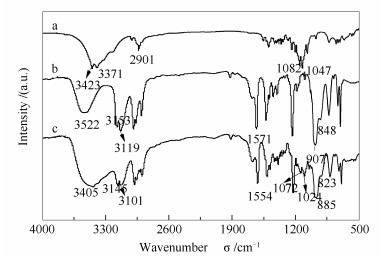 取一定量的催化剂[C4mim]ReO4与纤维二糖进行混合,在室温条件下磁力搅拌8 h,进行红外光谱分析,验证催化剂与低聚糖分子的相互作用,结果见图 6。由图 6可知,[C4mim]ReO4与纤维二糖的红外特征吸收峰均存在于混合物红外光谱谱图中,但混合体系中纤维二糖-OH吸收峰显著变宽,表明催化剂与纤维二糖分子的羟基存在分子间氢键作用,而葡萄糖糖苷键C-O-C振动吸收由1 047 cm-1移至1 024 cm-1,同时,氢键对供电体Re=O的红外吸收也有影响,化学位移由907和848 m-1移至885和823 cm-1。由于[C4mim]ReO4与纤维二糖不能互溶,两者的相互作用不强,但基本可以表明,ReO4-与低聚糖分子中羟基和β-1, 4-糖苷键存在相互作用,从而也可推断,高铼酸盐催化剂与微晶纤维素分子也应存在相同的作用,该作用是促进微晶纤维素水解的关键。