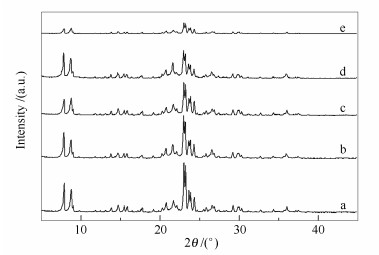 催化剂的物相分析采用RigakuD/MAX-1AX型型X射线衍射仪(XRD)进行分析,X射线源为Cu Kα (λ=0.154 06 nm),管电压40 kV,管电流100 mA。0°-80°扫描,扫描速率为4(°)/min。催化剂形貌采用日立公司S-4800型发射扫描电子显微镜(SEM)进行分析。加速电压:20 kV(0.1 kV/步,可变)。样品均匀分散在铜片导电胶上,拍摄前对其进行喷金处理。催化剂的N2吸附-脱附等温线、比表面积及孔径采用美国Micromeritics公司生产的ASAP2010型吸附仪(BET)进行测定,在77 K下以高纯氮为吸附质进行表征,测试前在573 K下脱气6 h。比表面积采用BET法计算,孔容由BJH法求得,t-plot法计算外表面积和微孔体积。催化剂的酸强度和相对酸量采用Micromeritics公司AutoChem2920全自动程序升温化学吸附仪(NH3-TPD)进行分析。称取100 mg分子筛样品放入U形石英管中,通入氦气对样品处理,样品在高纯He气氛600 ℃吹扫3 h后冷却至120 ℃,开始通10% NH3/He,持续3 h。后切换至He吹扫2 h,以10 ℃/min的速率升温至600 ℃,直至氨气达到饱和,利用氦气吹扫除去吸附的氨气后,脱附的氨气采用TCD检测。