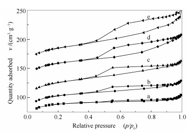 图 2为酸洗后HZSM-5分子筛的N2吸附-脱附等温线。由图 2可知,HZSM-5原粉无滞后环,属于典型的微孔结构等温曲线。当压力较高时,吸附量增大,说明颗粒之间存在一定的堆积孔[26]。经碱处理后的分子筛在p/p0为0.40-0.95的位置上出现了比较明显的滞后环。滞后环产生的原因是介孔分子筛在孔道内发生了毛细管凝聚现象。滞后环的出现说明碱处理引入了介孔结构。由文献可知[26],介孔结构多呈现出平板狭缝、裂纹、楔形孔等形状。经柠檬酸酸洗后滞后环变大,这可能是因为酸洗可以疏通孔道,起到扩张孔结构的效果。