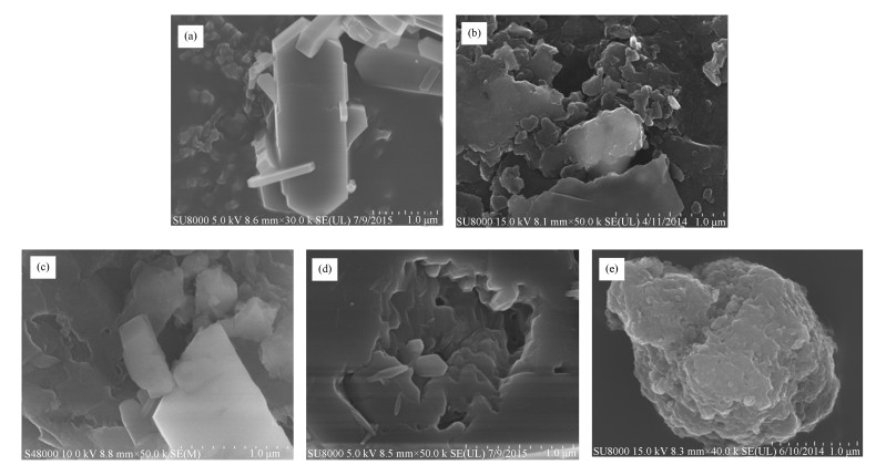 酸洗后HZSM-5分子筛的SEM照片见图 3。由图 3可知,HZ是立方形,其颗粒表面规整光滑、棱角分明,大部分晶粒聚集在一起。HZ(A)分子筛颗粒的棱角消失,表面变得凹凸不平,出现大量的裂纹、空穴现象,晶粒失去规整度,内部产生孔结构。酸洗后腐蚀的表面逐渐恢复平整,孔通道清晰。与HZ(A)相比,HZ(AC-0.1)、HZ(AC-0.5)分子筛的孔道结构较为明显,基本上没有残留的杂质碎片,可能因为柠檬酸酸洗后带走了非骨架Al,开阔了催化剂孔道。该结论与XRD、BET表征的结论基本相符,说明采用柠檬酸溶液进行酸洗能够起到规整、清理孔结构的作用。当酸洗的浓度不太大时,此时基本上不会对催化剂产生较大的腐蚀,因此, 不影响总体的形貌特征。而当酸洗的浓度过高时,催化剂的表面又有被腐蚀的迹象,邻近的晶粒之间开始相互黏连、棱角也消失,整体变得凹凸不平。因此,过高的酸洗浓度会对骨架铝产生一定影响。