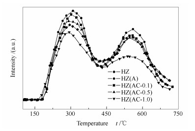 图 4为酸洗后HZSM-5分子筛的NH3-TPD谱图。当脱附峰的位置位于280-300 ℃时,其对应的是弱酸中心,它主要是由缺陷位的硅醇基对NH3吸附所致;当脱附峰位于550-580 ℃时,此时对应的是催化剂的强酸中心,它主要是与分子筛中的骨架铝有关。由图 4可知,HZ(A)的脱附峰相对于HZ有向高温区的方向移动迁移,而且峰面积增大。说明碱处理可以使样品的酸性增强,酸量增加。因为NaOH可以选择性脱除骨架硅,形成了可吸附NH3的硅醇基缺陷位,使HZ(A)的弱酸量大于HZ。一般认为,分子筛强酸位的浓度与其骨架铝的浓度成正比[27]。碱处理脱硅时也会间接暴露更多的骨架铝,提高了铝的相对浓度,致使强酸量增加。经过柠檬酸酸洗后HZSM-5分子筛样品的弱酸脱附峰面积有减小的趋势,这是因为柠檬酸清洗碱处理后产生的残留的铝,这是一种与骨架铝无关的无定形铝。而强酸脱附峰面积变化不大(HZ(AC-1.0)除外),这可能与分子筛中Al的分布密切相关。当柠檬酸浓度达到1.0 mol/L时,酸洗对分子筛表面酸性质的影响程度大,因为酸洗会脱除骨架铝,造成强酸脱附峰面积明显降低,这与XRD表征基本相符。