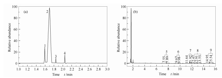 Sample Conversation x/% HZ HZ(A) HZ(AC-0.1) HZ(AC-0.5) HZ(AC-1.0) Thiophene 47.2 82.4 89.3 95.6 70.1 1-hexene 6.3 9.6 15.7 18.1 16.3 Xylene 8.9 11.4 18.3 20.5 15.4 reaction conditions: t=120 ℃, p=1.0 MPa, GHSV=1.0 h-1, t=6 h 图 5为HZ(AC-0.5)催化剂上反应前后模拟油1#的色谱谱图。图 5中(a)代表的是反应前的色谱谱图; (b)代表的是反应后模拟油的色谱谱图。由于模拟油中存在多种反应物,因此, 该反应体系具有较多复杂的反应。其中,噻吩能与1-己烯发生烷基化反应,生成己基噻吩。该反应是连续反应,己基噻吩会继续发生取代反应生成二己基噻吩。此外,1-己烯自身也会发生聚合反应生成多聚物;二甲苯与1-己烯也会发生一次取代反应和多次取代反应,生成烷基二甲苯。