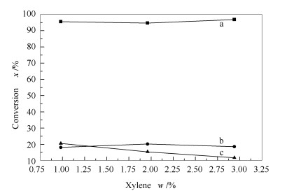 Model oil Conversion x/% HTS distribution w/% HXS distribution w/% thiophene 1-hexene aromatics HT DHT THT HX DHX 1# 95.6 18.1 20.5 30.3 60.9 8.8 89.2 10.8 8# 90.3 27.4 25.7 21.7 75.7 2.6 50.3 49.7 reaction condition: t=120 ℃, p=1.0 MPa, GHSV=1.0 h-1, t=6 h 通过比较1#、9#、10#模拟油反应物的转化率以研究不同含量的二甲苯对噻吩烷基化反应、1-己烯自聚反应、二甲苯烷基化反应的影响,结果见图 6。由图 6可知,当二甲苯含量逐渐增加时,1-己烯、噻吩的转化率变化不明显,但二甲苯的转化率下降,说明单位时间内提供给二甲苯的活性位比较有限,导致有大量的二甲苯未被活化,造成转化率的下降。当二甲苯的含量比较高时,噻吩烷基化反应的选择性有所提高。由三种反应物转化率的大小关系可以看出,尽管二甲苯的含量有所增加,但是噻吩的转化率仍比二甲苯的转化率高很多。说明二甲苯的反应条件更为苛刻,它对热力学条件要求更严格。