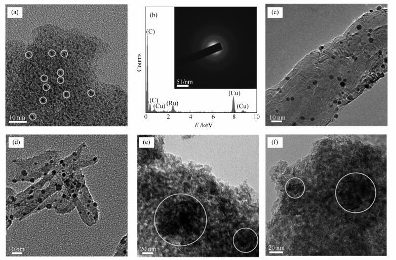 TEM characterization of the as-prepared catalysts was carried out to further study their structures and composition distributions. The TEM image of Ru/AC shows good dispersion of the Ru nanoparticles (marked with white circles) with very small size, as shown in Figure 3(a). The Energy Dispersive X-ray Spectroscopy (EDS) pattern confirms the presence of Ru in this sample and the Selected Area Electron Diffraction (SAED) pattern indicates that the Ru particles have a polycrystalline structure without preferred crystal orientation (Figure 3(b)). Ru nanoparticles of Ru/CNT are uniformly dispersed on CNT in Figure 3(c). In contrast, the Ru/FCNT sample presents much larger Ru particles that are poorly dispersed on FCNT support (Figure 3(d)). Evidently, the surface functionalization of CNT results in closely packed and more unevenly dispersed Ru particles. It is well known that the functional groups such as -COOH and -OH on the surface of FCNT not only improve the dispersion and stability of FCNT in solvents, but also help anchoring metal nucleus and lead to formation of uniform small Runanoparticles[30, 31]. Interestingly, the present observation is opposite to the literature reports, which may be due to the unusual mechanism of microwave heating in catalysts preparation. It is proposed that the Ru particles deposited on the defective area of FCNT surface grow larger by attracting other surrounding Ru particles during rapid microwave heating. On the contrary, the intermolecular forces between Ru particles and the pristine CNT surface will be stronger from rapid heating, so that the particles cannot move, which leads to highly dispersed Ru particles. There is minor agglomeration of Ru particles in Ru/γ-Al2O3-MW (Figure 3(e)) and Ru/γ-Al2O3-IM (Figure 3(f)), and the particles (marked with white circles) are oriented in clusters without any clear fringes. Both Ru/γ-Al2O3-MW and Ru/γ-Al2O3-IM present nonuniform particle dispersions though the γ-Al2O3 support has larger surface area than both CNT and FCNT. This could be due to the amorphous nature of γ-Al2O3, such that Ru particles are not well anchored on the surface, leading to facile formation of Ru clusters.