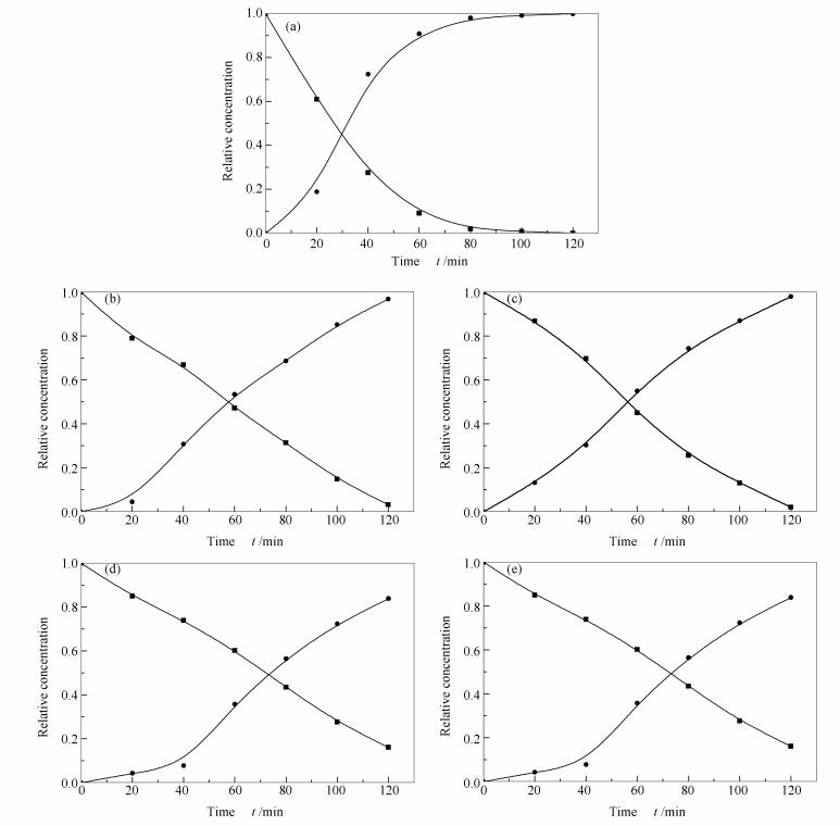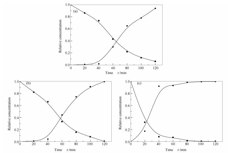The catalytic performances of these materials in aqueous-phase LA conversion to GVL were tested. The reaction was performed in a 50 mL stainless steel autoclave with a mechanical stirrer and an electric temperature controller. Prior to reaction, the obtained catalysts were reactivated with H2 at 250 ℃ for 2 h, in order to form the active catalytic species. In a typical catalytic run, the reaction mixture containing 25.00 mL of LA aqueous solution, and 0.1000 g catalysts were charged into the autoclave under Ar atmosphere. The reactor was sealed and pressurized to the required hydrogen pressure, a stirring speed of 500 r/min, and then heated to the desired temperature. Samples (0.50 mL) were withdrawn at regular intervals through a sample loop. The analysis of products was performed by a 7980 F gas chromatograph equipped with a flame ionization detectorand a FFAP GC column.