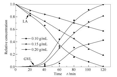 Solvent Con.x/% Sel.s/%b By product Reaction rate/(10-3 mol·L-1·min-1)c Water 100 100 17.25 Cyclohexane 96 100 16.21 Anisole 52 41 phenol, methanol 8.82 Methanol 32 86 levulinic acid methyl ester 5.94 Ethanol 27 75 ethyl levulinate 4.29 a: reaction conditions: 0.1000 g 5% Ru/AC catalyst; cLA, 0 = 0.10 g/mL, 100 ℃, 2.0 MPa for 2 h; b : selectivity for GVL; c: the reaction rates were calculated through the slope of the profile to each reaction 2.2.3 Effect of reaction time and reaction temperature