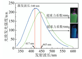 分别利用荧光分光光度计(激发光波长为340nm)、手提式紫外分析仪(激发光波长340nm)测量、照射两种水相SiC量子点溶液,其发射光谱测定结果与荧光颜色如图 4所示。可以看出,高速离心处理采用不同的离心力对量子点水相溶液的光致发光强度及半峰宽影响不大,但二者光致发光强度峰值对应的特征发射波长有较大变化。离心力为3000×g时,量子点的光强峰值出现在445nm处;而离心力为5000×g时,量子点的光强峰值出现在417nm处,也即光致发光强度峰值的特征发射波长发生了蓝移(28nm),该蓝移是由不同离心力离心处理获得量子点尺寸的减小所引起的。手提式紫外分析仪照射上述两种不同粒径量子点水相溶液,结果离心力为3000×g的量子点发出绿色荧光,而离心力为5000×g时量子点发出蓝绿色荧光。同一波长激发光的激发下量子点荧光颜色的变化规律与特征发射波长的蓝移相吻合。综上分析,有理由认为,高速离心不同离心力的施加通过改变单分散SiC纳米颗粒的尺寸进而影响其光致发光特征发射光谱特性,最终使SiC量子点荧光颜色发生变化,这充分体现了SiC量子点的谱带多元化特性,同时这种工艺-尺寸-光谱关联机制的建立,为今后生物学中客体的多目标荧光标记与检测提供了坚实的研究基础。