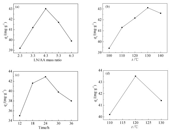 $q_{\mathrm{e}}=\frac{V\left(c_{0}-c_{\mathrm{e}}\right)}{m} $ (1) 式中,V为溶液体积(L),c0为溶液初始浓度(mg/L),ce为吸附后溶液浓度(mg/L),m为吸附剂的质量(g)。