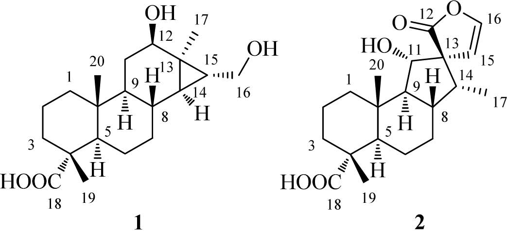 The natural cassane diterpenes are rearranged products of pimarane precursors by amethyl migration fromC-13 to C-14 in the biosynthetic pathway of diterpenes. Although rearranged cassanetype and pimarane-type diterpenes have been reported from the genus Caesalpinia, their number is still a few [13, 16, 22-24]. Our previous study led to the isolation of 10 new cassane diterpenoids from C. bonduc [25]. As a part of our ongoing program toward the discovery of structure-attractive and bioactive compounds fromthe genus Caesalpinia, two new rearranged diterpenoids (Fig. 1) were isolated from the seeds of C. sappan. Among them, tomocinol C (1) showed a rare 6/6/6/3-membered ring system deriving from an ordinary pimarane-type diterpene. Spirocaesalmin C (2), possessing a spiro-heterocyclic skeleton, waspresumably consideredtobe from an ordinary cassane-type diterpene. Herein, we report the isolation and structure elucidation of compounds 1 and 2.