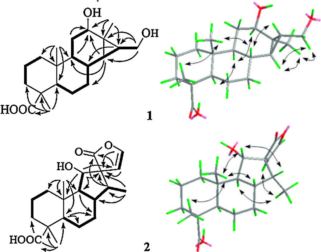 Compound 1, isolated as colorless crystals frommethanol, had a molecular formula of C20H32O4 as determined by the pseudomolecular ion peak at m/z 359.2202 [M+ Na]+ in HRESIMS with five degrees of unsaturation. The IR absorption bands at 3420 and 1726 cm-1 indicated the presence of hydroxyl and carbonyl groups, respectively. The 1H NMR (Table 1) spectrum displayed signals attributable to three tertiary methyls (δH 0.82, 1.12, 1.20), an oxygenated methine (δH 3.78, dd, J = 10.3, 5.9), and an oxygenated methylene (δH 3.50, dd, J = 11.3, 6.9; δH 3.60, dd, J = 11.3, 6.9). All carbon signalswerewell resonated in the 13CNMRandDEPT spectra (Table 1), and were classified as three methyls, seven methylenes (one oxygenated), six methines (one oxygenated) and four quarternary carbons (one carboxyl). To accommodate seven degrees of unsaturation implied by themolecular formula, compound 1 was proposed to be a tetracyclic diterpenoid. The proton signals were assigned to the corresponding carbons through direct 1H and 13C correlations in the HSQC spectrum. The 1H-1H COSY data (Fig. 2) enabled the construction of the partial structures depicted by the bold lines, whichwere connected through analysis of theHMBC data (Fig. 2). The obvious upfield shift of two methines (δH 0.35, δC 34.5, CH-14; δH 0.96, δC 29.4, CH-15) and a quaternary carbon (δC 28.0, C-13), together with the HMBC correlations from the oxygenated methylene (H2-16) to C-13, C-14, and C-15, suggested that C-13, C-14 and C-15 formed a cyclopropane ring with a hydroxymethyl attached to C-15. The hydroxyl group was assigned at C-12 on the basis of the HMBC correlations from H-9 and H2-11 to C-12. The observed HMBC correlations from a tertiary methyl at δH 1.20 (H3-17) to C-12 and C-15 confirmed its location at C-13. In addition, theHMBCcorrelations fromH3-19toC-3, C-5anδC-18, andfromH3- 20 to C-1, C-5 and C-9 were observed, which proved the locations of twomethyls. The planar structure of 1was eventually established as a 6/6/6/3-membered ring system(Fig. 1). The relative structure of 1 was determined by theROESY experiment (Fig. 2). The cross peaks of H3-19/H3-20, H3-20/H-8, H-8/H-15, H-5/H-9, H-9/H-12, H-14/H2-16 and H2-16/H3-17 suggested that CH3-19, CH3-20, H-8 and OH-12 were b-oriented, while C-18, H-5, H-9, H-12, H-14, H2-16 and H3-17 werea-oriented.Asingle crystal X-ray diffraction experimentwith a Cu radiation source confirmed further the whole structure of 1 including the absolute configuration (Fig. 3).Therefore, the structure of 1 was established as shown and named tomocinol C.