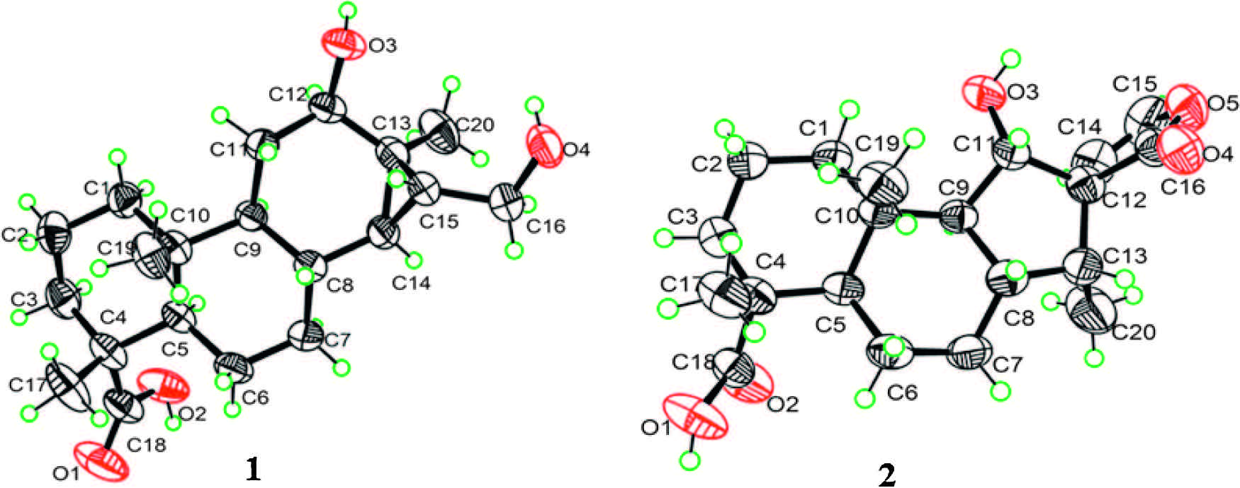 Two rearranged diterpenes, tomocinol C(1) andspirocaesalmin C (2), were fully characterized fromthe seeds of C. sappan. TomocinolC (1) exhibited a rare carbon framework with a 6/6/6/3-membered ring system, which was proposed to be rearranged froma pimarane diterpenoid by forming a new linkage between C-14 and C-15. Spirocaesalmin C (2), featuring by a spiro-heterocyclic structure, was probably a rearranged product of a cassane diterpene with a migration of the C-11 fromC-12 to C-13. Both skeletons were rarely found, with only a few literatures reported.