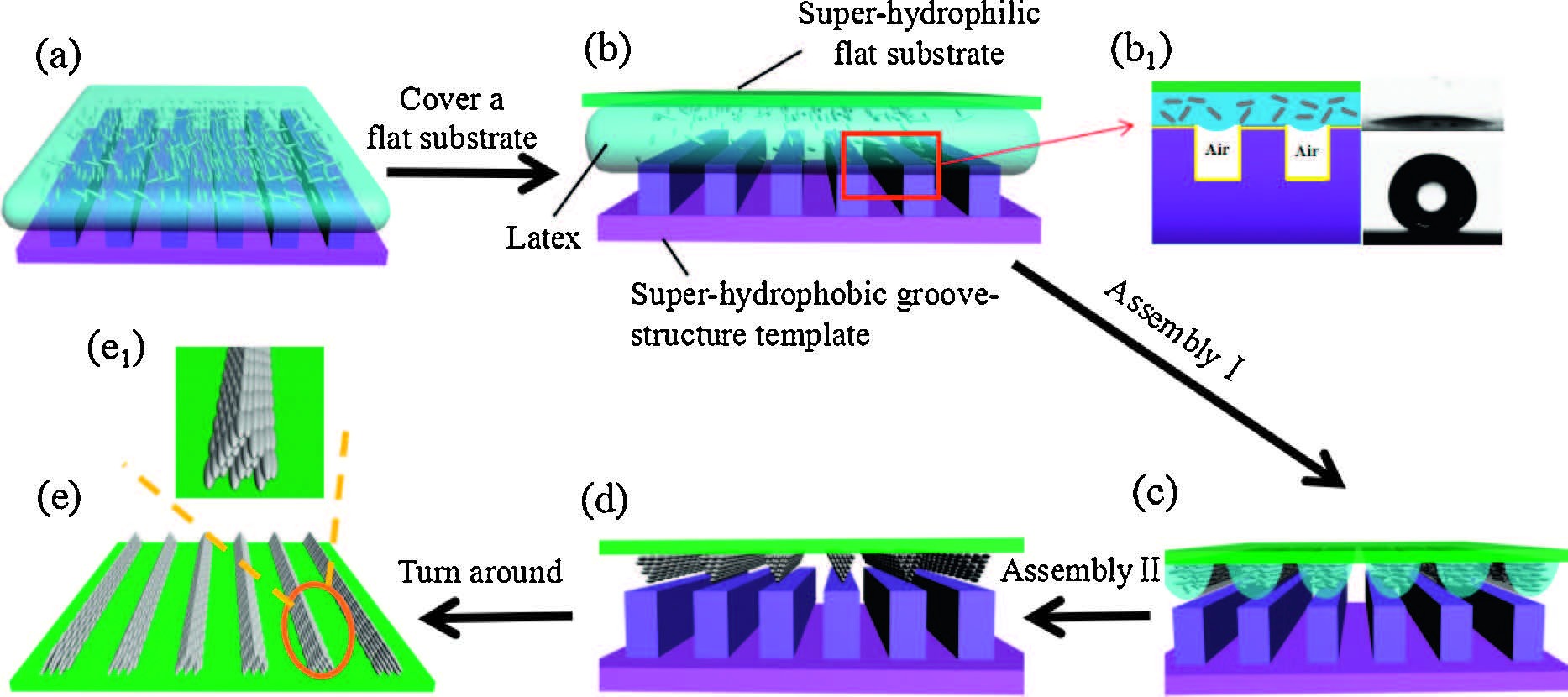 Figure 1 Schematic of process of pattern assembly based on sandwich approach. (a, b) rod-like Silica latex was carefully dropped onto the superhydrophobic groove-structured template and covered by a flat superhydrophilic transfer substrate, yielding a fixed-gap sandwich assembly system. The assembly system was put at constant template/ humidity for 12h. (b1) Schematic of the contact position for the silica particle latex between the superhydrophobic template and superhydrophilic transfer substrate, the inset is the shape of the water droplet on the transfer substrate and the template, respectively. (c, d) With the solvent evaporation, the groove wall array served as wetting defects to control the rupture of silica latex, yielding a micrometer-scale liquid film between the substrate and the top surface of the groove wall. Such a liquid bridge provides a gradually reducing confined space for latex aggregation. (e) Close-packed, linear assembly arrays of silica particle can be formed upon the substrate. After the removal of the groove-structured template by physical peeling, a precisely positioned assembly pattern with a orderly orientation can be generated, the rod-like particles are arranged based on the direction of line.