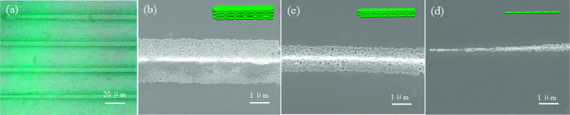 图 2 (a) Optical image and (b-d) SEM images of the as-fabricated linear-assembly from rod-like silica particles. (a, b)15 wt%, (c) 8 wt%, (d) 2 wt%, respectively. Inset schemes the possible assembly way of the rod-like silica particles.Figure 2. (a) Optical image and (b-d) SEM images of the as-fabricated linear-assembly from rod-like silica particles. (a, b)15 wt%, (c) 8 wt%, (d) 2 wt%, respectively. Inset schemes the possible assembly way of the rod-like silica particles.To understand what affects the orientated assembly of the anisotropic particles, we analyzed the whole assembly process of the particles under the interaction of the sandwich structure in Fig. 3. Three crucial steps are responsible for the process. The first one is the confined effect [11], which is resulted from the combined interaction of the superhydrophobic template and the superhydrophilic substrate as shown in Fig. 3b1. The superhydrophobic template causes the difficult dispersion of the latex suspension on the substrate, while the suerphydrophilic substrate facilitates the effectively spread of the latex suspension onto the substrate, forming the triangle assembly structure as shown in Fig. 1c. All of these lead to the location of the liquid suspension between the space of the template and substrate. The second is break of the liquid film during the solvent evaporation procedure, the receding of TCL aroused from solvent evaporation causes the rupture of the liquid film at the weak linkage region between the superhydrophobic template and superhydrophilic substrate. The final step is the formation of the linear assembly with triangle-shaped structure between the template and substrate. As regarding of the orientated assemblyofthe rod-like silica, it can be attributed to the largest driven force formed in this direction (F2) and the force between particles (F1), which leading to the preferable orientated assembly of the anisotropic particles by retraction direction of the TCL. Wherein, the F2 is aroused from the retraction force of receding TCL, while the F1 is produced from the interactions of particles.