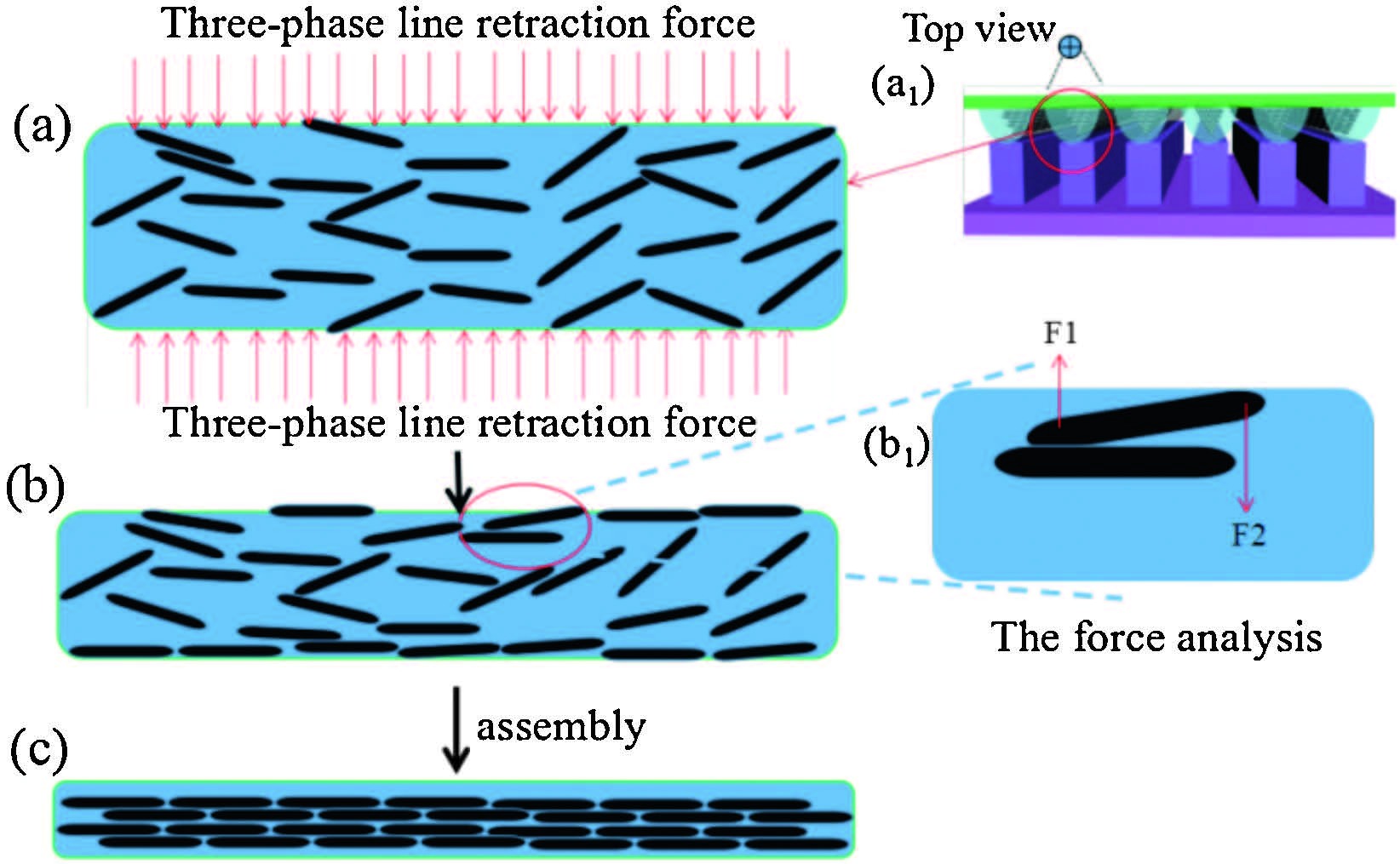图 1 Schematic of process of pattern assembly based on sandwich approach. (a, b) rod-like Silica latex was carefully dropped onto the superhydrophobic groove-structured template and covered by a flat superhydrophilic transfer substrate, yielding a fixed-gap sandwich assembly system. The assembly system was put at constant template/ humidity for 12h. (b1) Schematic of the contact position for the silica particle latex between the superhydrophobic template and superhydrophilic transfer substrate, the inset is the shape of the water droplet on the transfer substrate and the template, respectively. (c, d) With the solvent evaporation, the groove wall array served as wetting defects to control the rupture of silica latex, yielding a micrometer-scale liquid film between the substrate and the top surface of the groove wall. Such a liquid bridge provides a gradually reducing confined space for latex aggregation. (e) Close-packed, linear assembly arrays of silica particle can be formed upon the substrate. After the removal of the groove-structured template by physical peeling, a precisely positioned assembly pattern with a orderly orientation can be generated, the rod-like particles are arranged based on the direction of line.Figure 1. Schematic of process of pattern assembly based on sandwich approach. (a, b) rod-like Silica latex was carefully dropped onto the superhydrophobic groove-structured template and covered by a flat superhydrophilic transfer substrate, yielding a fixed-gap sandwich assembly system. The assembly system was put at constant template/ humidity for 12h. (b1) Schematic of the contact position for the silica particle latex between the superhydrophobic template and superhydrophilic transfer substrate, the inset is the shape of the water droplet on the transfer substrate and the template, respectively. (c, d) With the solvent evaporation, the groove wall array served as wetting defects to control the rupture of silica latex, yielding a micrometer-scale liquid film between the substrate and the top surface of the groove wall. Such a liquid bridge provides a gradually reducing confined space for latex aggregation. (e) Close-packed, linear assembly arrays of silica particle can be formed upon the substrate. After the removal of the groove-structured template by physical peeling, a precisely positioned assembly pattern with a orderly orientation can be generated, the rod-like particles are arranged based on the direction of line.Orientated assembly of rod-like silica based on sandwich approach:A heptadecafluoro-1, 1, 2, 2-tetradecyltrimethoxysilane modified groove-structured silicon substrate with width of 5 mm, gap of 20 mm, and height of 20 mm was held horizontally. Then rod-like silica suspension (5 wt% in water, with 20 mL SDBS (0.2 mg/mL)) was carefully dropped onto the template and covered by a flat substrate, yielding a sandwich assembly. After the assembly system was kept at 20 ℃ for 12 h, linear-like assemblies were achieved from rod-like silica. It is noted that controlling the gap between the chosen substrate and the groove-structured template at ca. 20 mm is crucial for obtaining a continuous liquid stripe. The process of other pattern assembly was similar except changing the kind of templates, the optic microscopy images of template are shown in Fig. S4 in Supporting information.