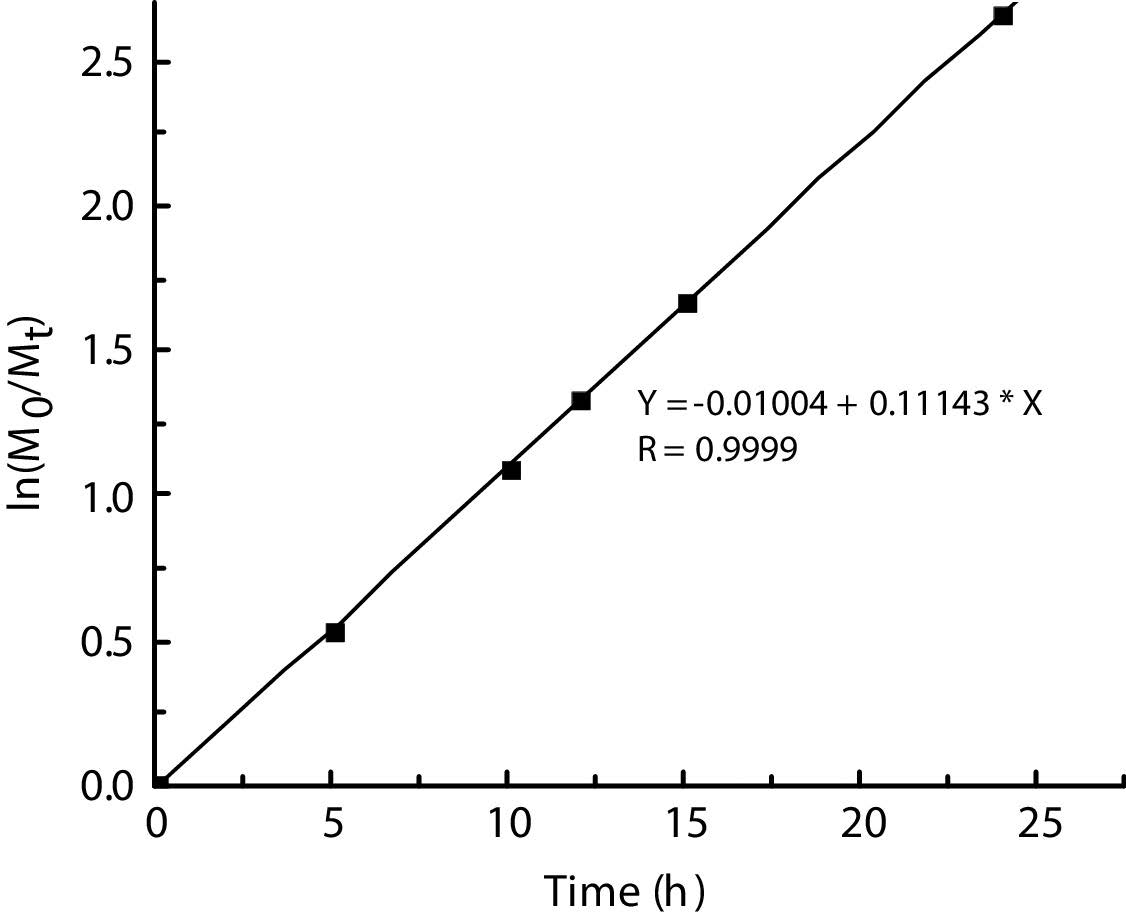 Our polymerization results are much superior to those reported for copper complexes with elaborate ligands [15-18]. Literature report for the polymerization of L-lactide using three different copper phenoxy-ketimine complexes at 160 ℃ found to be Mn = 2200 4500 and 6500 g/mol, respectively [16] suggests our results are superior in terms of Mn (Table 1). This may be due to faster propagation than initiation has occurred. The kinetic studies for the ROP of lactide has been observed in the presence of BnOH in the ratio [LA]/[Cu-HMBED]/[BnOH] = 100/1/1 (Fig. 2). This plot implies that the polymerization reaction obeys first-order kinetics with the value of kapp for L-lactide polymerization was found to be 0.11143 h-1.