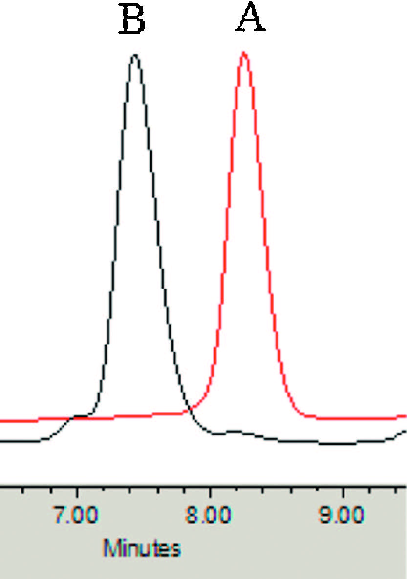 The PLA-b-MePEG was obtained by stirring the mixture of copper complex Cu-HMBED, MePEG and L-lactide of equivalent amount in toluene at room temperature for 4 h. The 1H NMR spectrum of PLA-b-MePEG (Fig. 3) show a triplet of methylene protons (3.65 ppm), a typical quartet of methine proton (5.16 ppm), and a doublet of methyl protons (1.58 ppm) show the block nature of the PLA-b-MePEG polymer. It is further verified by the GPC graph. Fig. 4 shows that the peak A for the MePEG (Mn = 2000, PDI = 1.06) appeared at 8.18 min and after formation of copolymer PLA-b-MePEG, the peak B appears at 7.31 min and the MePEG peak was disappeared. Thermal degradation of PLA and PLA-b-MePEG was investigated by TGA. It can be concluded that the PLA is thermally stable up to a temperature of 200 ℃, whereas PLA-b-MePEG is found to be stable up to 250 ℃. This may be attributed to the high molecular weight of PLA-b-MePEG [25].