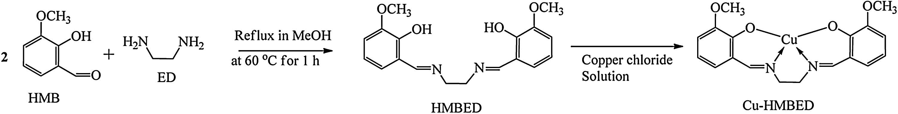The copper complex (Cu-HMBED) was synthesized (Scheme 1) by refluxing the methanolic solution of Schiff base and copper chloride in a round bottom flask at 60 ℃ for 7 h as per the modified synthetic rout reported in the research paper [21]. All reactions were performed under nitrogen atmosphere. Finally, copper complex was recrystallized in methanol and dried in a vacuum desiccator. The TGA of HMBED Schiff base showed a weight loss of 50.4 wt% at 500 ℃, but its copper (II) ion complex showed a weight loss of 37.0 wt%, which indicates that Cu-HMBED complex was more stable in comparison to ligand. Due to the formation of copper complex, there was a considerable difference in IR bands for > C55N and > C-O groups and also two new absorption bands at 566 cm-1 and 442 cm-1 come into sight due to the formation of Cu-O and Cu-N bonds in Cu-HMBED complex. And also, vanishing of phenolic OH band between 2800 and 3000 cm-1 of HMBED Schiff base was a confirmation for the formation of Cu-HMBED.