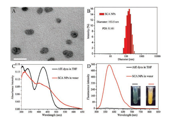 Figure 1 (A) TEM image of SCA NPs. Scale bar in TEM image: 500 nm. (B) DLS intensity-weighted diameter of SCA NPs. (C) Absorbance spectra and (D) PL (excited at 450 nm) spectra of AIE dyes and SCA NPs. Insets: Photographs of AIE dyes in THF, and SCA NPs in water under UV light (365 nm), respectively.