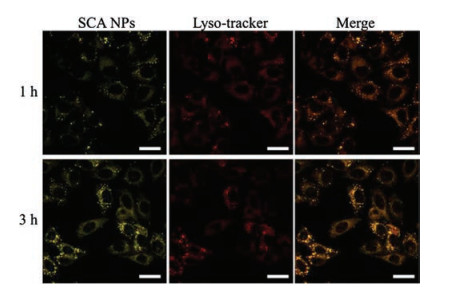 Cellular uptake is necessary for nanomaterials to exert their functions. Further cell imaging study employed HeLa cells as a cell model toverifythe cellular uptake and localization of SCA NPs with CLSM. 4, 6-Diamidino-2-phenylindole (DAPI) was used to stain the cell nucleus. As presented in Fig. S8 (Supporting information), an intense homogeneous cytoplasmic yellow fluorescence around nucleus can be clearly observed aftercultured with the SCA NPs for 1h, indicating the SCA NPs can be successfully taken up and localize in the cytoplasm and the perinuclear region within the cells. In addition, we used Lyso-tracker to stain the endosome after incubation with SCA NPs for 1 or 3 h at 37 ℃ in the culture medium. As presented in Fig. 3, yellow fluorescence from SCA NPs was observed in HeLa cells and well merged with red fluorescence from Lyso-tracker, indicating the SCA NPs localize with the endosome in the cytoplasm. Moreover, SCA NPs exhibit internalization by living cells with a time-dependent manner. These results manifest that SCA NPs could be applied as an effective fluorescent bioprobe for cellular imaging with high signal-to-noise ratio.
