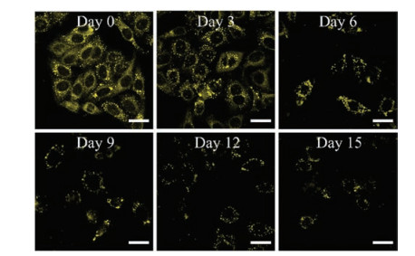 To investigate the non-invasive long-term cellular tracking capability of SCA NPs, we captured fluorescence images at different incubation periods (Fig. 4). HeLa cells were first incubated with SCA NPs for 6 h at 37 ℃ (labeled as day 0). The treated cells were then subcultured for designated time intervals and each sample was detected by CLSM. For each cell passage, the old culture medium was extracted and HeLa cells were washed with PBS twice to remove the existing SCA NPs in the culture medium. At the initial stage (day 0), strong yellow fluorescence from SCA NPs can be clearly observed. With the increase of incubation time (from day 3 to 15), the yellow fluorescence gradually decreases because of cell proliferation, in which SCA NPs divide into daughter cells. Importantly, after 15 days of subculture, the yellow fluorescence from SCA NPs was still clearly observed in HeLa cells, which indicates that SCA NPs can act as fluorescent probes for long-term cellular tracing and imaging. More importantly, this long-term tracking strategy is based on cellular proliferation containing endogenous organic nanoprobes rather than continuous exogenous addition of imaging agents during long-term monitoring. This non-invasive nature makes SCA NPs suitable for potential clinical bio-imaging.