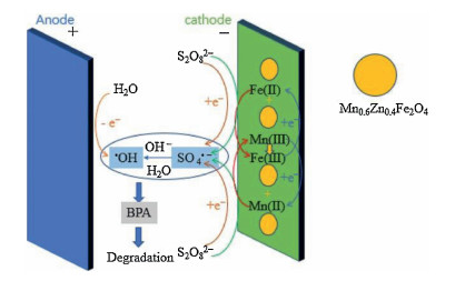 Figure 2. Schematic diagram of the mechanism of the electro/Mn0.6Zn0.4Fe2O4/PDS process. Copied with permission [49]. Copyright 2018, Elsevier.For the Fe-M oxides, the activation reaction was similar to the PS activation by MFe2O4 via the valence variation of Fe and M. For example, the activation mechanism of PS by Fe-Co/SBA-15 was based on the Fe(Ⅱ) and Co(Ⅱ) generated on cathode and the further PS activation by Fe(Ⅱ) and Co(Ⅱ), which could be expressed through the Eqs. (5), (9), (12) and (13) [51]: