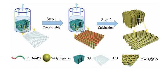 Figure 1 Schematic formation process of the mesoporous WO3/GA nanocomposites. In Step 1, PEO-b-PS copolymers were completely dissolved in THF, to form a clear and transparent solution. The oligomers of tungsten species were generated from the hydrolysis and condensation of inorganic WCl6 precursors, which were associated with the protonated hydrophilic PEO segments of PEO-b-PS copolymers. As evaporation of the solvent, the spherical PEO-b-PS/inorganic sol composite micelles with PS blocks as the core and PEO segments as the shell were formed and packed into mesostructure on the surface of GA nanosheets. In Step 2, the mWO3@GA nanocomposites were obtained by calcination at 350 ℃ for 2 h and then at 500 ℃ for 1 h in Ar atmosphere.