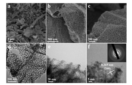 The morphology and fine structure of mWO3@GA nano-composites were closely characterized by SEM and TEM, respec-tively. From SEM images in Fig. 3a, it can be seen that the sample of mWO3@GA has a highly interconnected 3D framework containing macropores in diameter of 2–8 μm and very thin rGO sheets with a large exposed surface, which is quite similar with GA monolithic support (Fig. 2a). However, the surface of rGO sheets became rougher after coating mesoporous WO3, showing a great number of mesopores existing within WO3 layer (Figs. 3b and c), further demonstrating that mesoporous WO3 was successfully deposited on the surface of rGO sheets through a modified solvent evaporation induced self-assembly strategy. In fact, the spherical mesopores of WO3 are arranged in a nearly hexagonal pattern and vertically distributed on the GA supports, and the pore size is estimated to be around 19 nm (Fig. 3c). The thickness of the mWO3@GA sheets is in the range of 25–35 nm (Fig. 3b), which is much thicker than that of rGO sheets. In contrast, when GO sheets were directly used as substrate, no uniform mesoporous WO3 layer was grown on the GO sheets (Figs. S4a and b in Supporting information), and the irregular WO3 nanoparticles in size of 100–300 nm was loosely dispersed on the surface (Figs. S4c and d in Supporting information), mainly due to too many oxygen groups on GO sheets and the oxygen-containing functional groups promoted the rapid hydrolysis of the precursors of tungsten oxide, which was very disadvantageous for the assembly of the tungsten oxide and the surfactant to form a mesostructure. Besides, when no support of GO or rGO sheets was added in the synthesis, the bulky mesoporous WO3 with uniform ordered mesopores in average pore size of 19 nm was formed (Figs. S4e and f in Supporting information), which is quite consistent with our previous report [14]. TEM images of mWO3@GA (Figs. 3d and e) further prove that the rGO sheets are uniformly coated by mesoporous WO3 thin layers, which contain the perpendicularly aligned mesopores with a diameter of about 19 nm and a wall thickness of about 8 nm, formed by the thermal decomposition of PEO-b-PS as the template. After assembly with mesoporous WO3, the 2D sheet structure of rGO substrate can be remained, showing a translucent graphene layer through the perpendicular mesopores of thin WO3 layer (Fig. 3e). Furthermore, HRTEM image in Fig. 3f clearly shows a great number of ultrafine WO3 nanoparticles in size of ~8 nm, implying that the framework of mesoporous WO3 consists of highly crystallized WO3 nanoparticles. The lattice spacing of the WO3 nanoparticles is calculated to be about 0.365 nm, corresponding to the (200) lattice plane of monoclinic WO3. Selected-area electron diffraction pattern (SAED, inset in Fig. 3f) shows several well-resolved diffraction rings, corresponding to the (200), (020) and (002) lattice planes of monoclinic polycrystalline WO3, respectively.