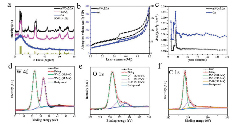 X-ray photoelectron spectroscopy (XPS) was further used to investigate the surface composition and elemental states of mWO3@GA, and the survey-scanned spectrum proves the existence of W, C, and O elements (Fig. S6 in Supporting information). The high-resolution W 4f XPS spectrum can be deconvoluted into two peaks at 35.6 and 37.7 eV (Fig. 4d), corresponding to W 4f7/2 and W 4f5/2 of W6+ in mesoporous WO3, respectively [39, 40]. The deconvolution of O 1s XPS spectrum results in three peaks at 530.5, 531.7 and 533.2 eV (Fig. 4e), which are attributed to the lattice oxygen, chemisorbed oxygen species and surface O=C groups in rGO [41, 42], respectively. Usually, the adsorbed oxygen is more active to react with reducing gases than lattice oxygen, because it can greatly change the concentration of main carriers [14, 43]. The C 1s XPS spectrum can be fitted into three peaks centered at 284.1, 285.1 and 288.3 eV (Fig. 4f), which are associated to C-C (from graphitic sp2 carbons), C–O and C=O (from oxygenate groups attached to the carbon atoms) on the surface of GA monolithic support [32, 44], respectively. As an effective analysis method, Raman spectroscopy can be used to characterize G and D bands of graphene and its derivatives, and the intensity ratio of D band to G band (ID/IG) is usually recognized to reflect the defects and disorder degree of the graphitized structure, which can also be used to estimate the fraction of sp3/sp2-bonded carbon [33]. The Raman spectra of both GA and mWO3@GA nanocomposites in Fig. S7 (Supporting information) display the D band at 1344 cm -1 and G band at 1598 cm-1, respectively. The intensity ratio (ID/IG) for mWO3@GA (1.07) is slightly larger than that for GA (0.91), indicating that the former sample has more defects and higher disorder degree, which could be beneficial for improving gas sensing performance by boosting the adsorption of oxygen and gas species [45].