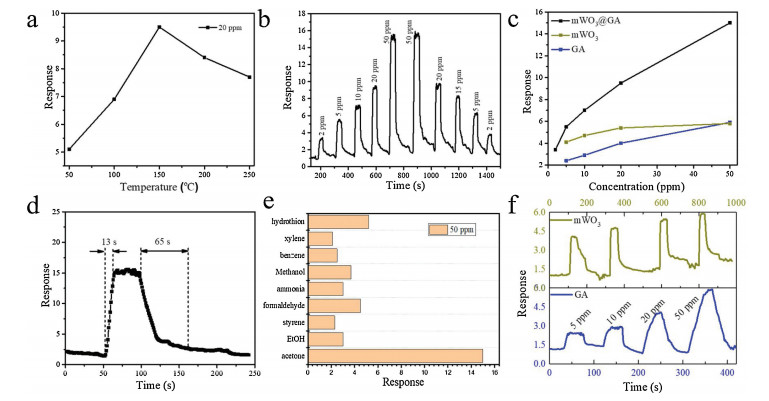 Figure 5 Responses (S = Ra/Rg) of the mWO3@GA nanocomposites-based sensor to 20 ppm acetone at different temperatures (a), response-recovery curve of the sensor to acetone at different concentrations (2–50 ppm) at 150 ℃ (b), response of the sensors vs. acetone concentrations (c), response-recovery curve of the mWO3@GA sensor to 50 ppm of acetone at 150 ℃ (d), responses of the sensor to different gases of 50 ppm at 150 ℃ (e), response-recovery curve of mesoprous WO3 and GA sensors to acetone at different concentrations (2–50 ppm) at 150 ℃ (f).