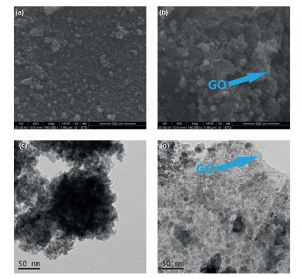 Figure 1. SEM images of CuFe2O4 (a) and CuFe2O4@GO (b); TEM images of CuFe2O4 (c) and CuFe2O4@GO (d).Fig. 2a shows the XRD spectra of the synthesized materials. For the pure CuFe2O4, there were seven intense peaks at 2θ of 30.32°, 35.6°, 38.75°, 43.66°, 54.03°, 57.37° and 63.11° indexed to (112), (211), (202), (220), (105), (321) and (224) planes of copper ferrite, indicating successful formation of the tetragonal CuFe2O4 spinel with considerable degree of crystallization [4]. For CuFe2O4@GO hybrids, all diffraction peaks of CuFe2O4 were detected, and an obvious characteristic diffraction peak of GO appeared at around 12°, indicating that the successful preparation of CuFe2O4@GO catalyst.