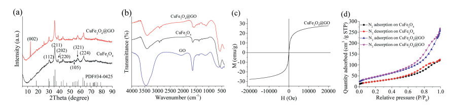 The magnetization curve of the prepared CuFe2O4@GO is displayed in Fig. 2c. The saturation magnetization (Ms) value of CuFe2O4@GO was 27.89 emu/g, which is less than that of CuFe2O4 (30 emu/g) [13], which is due to the introduction of non-magnetic GO. However, the CuFe2O4@GO composites dispersed in water still could be easily separated in a few seconds by an external magnet.