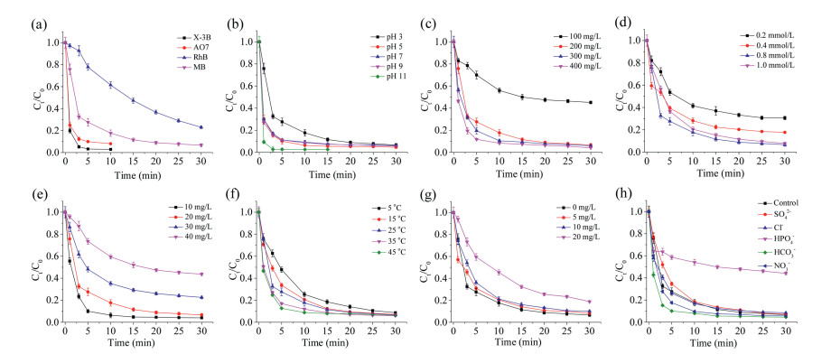 Figure 3. Effects of operational parameters on the catalytic degradation process: (a) dye type, (b) solution pH, (c) catalyst dosage, (d) PMS dosage, (e) dye concentration, (f) temperature, (g) HA and (h) inorganic anions. Typical experimental conditions: MB = 20 mg/L, CuFe2O4@GO = 200 mg/L, PMS = 0.8 mmol/L, T = 25 ℃.Fig. 3b illustrates the effect of pH on MB catalytic degradation. In the first 5 min of reaction, the efficiency of MB degradation increased from 75.7% to 97.3% when pH was increased from 3 to 11, which may be due to reduction of solvent cage effect by elevated ionic strength [9]. However, after 30 min, the MB degradation rate showed no differences and surpassed 93% at different pH conditions. The addition of PMS reduced the solution pH to 3 without adjustment, and we chose pH 3 for the following studies considering the ease of operation.