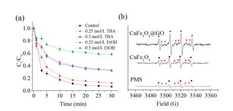 According to the literature, both SO4- · and ·OH radicals can be generated during the activation of PMS by the metal-based catalysts [22]. To identify the possible roles of radicals in MB degradation in the CuFe2O4@GO/PMS system, EtOH and TBA, radical scavengers, were added into the system to capture radicals. EtOH can capture SO4- · and ·OH, while TBA can capture ·OH. With the addition of 0.25 mol/L TBA and EtOH, the degradation efficiency of MB was declined to 87.6% and 74.1%, respectively; increasing TBA and EtOH concentration to 0.5 mol/L resulted in further decrease of degradation efficiency to 67.9% and 41.5%, respectively (Fig. 4a). The much higher inhibitory effect of EtOH in comparison to TBA suggests that both ·OH and SO4- ·radicals played the important role during the activation of PMS by CuFe2O4@GO.