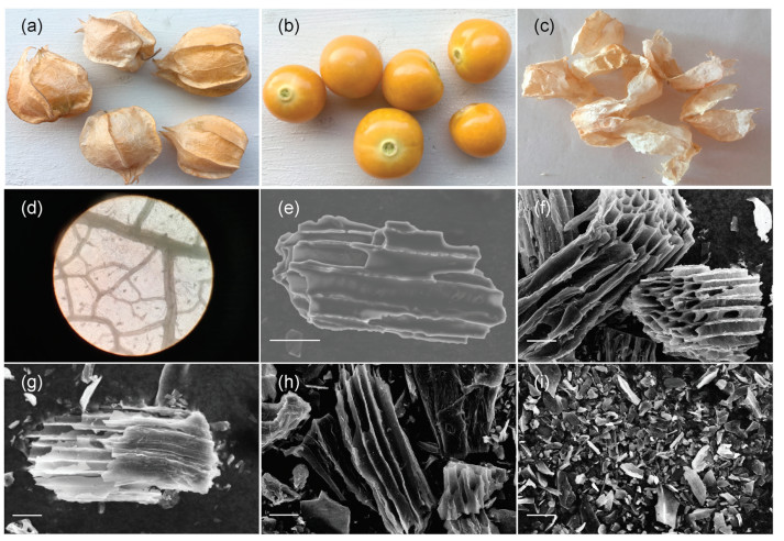 Figure 1. (a) Photos of Physalis peruviana L. (b) The pulp and (c) the calyx. (d) Micrograph of PC. SEM images of (e) PCC-0, (f) PCC-1, (g) PCC-2, (h) PCC-3 and (i) PCC-4. Scale bar: 20 μm.In this work, we generated a novel biomass carbon material (named PCC) derived from Physalis peruviana L. calyx. The results demonstrated that PCC performed long microtubule bundling with abundant O element on the surface. After chemical etching, PCC exhibited high specific capacitance with excellent cycling stability, which was expected to be utilized as an excellent electrode material in diverse renewable energy storage [21, 22].
