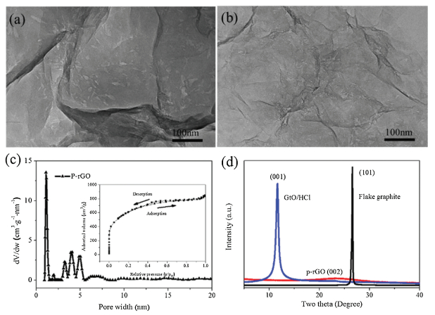 The TEM images of p-GO and p-rGO (after reduction) samples are shown in Figs. 2a and b, respectively. These two samples both exhibit the morphological characteristic features of a crowd wrinkle, and many specific porous regions possess varying morphology and size. Compared with that of the p-GO sample, the surface of the p-rGO sample contained holes. The above result indicates that the reduction process might influence pore formation. As shown in Figs. 2a and b, the defect areas possess numerous micropores and mesopores with a wide range of sizes (0.8–7 nm), consistent with the pore size (approximately 3 nm) calculated from the N2 sorption isotherms (Fig. 2c). Fig. S2 (Supporting information) shows the PG with size of ~5 μm and layer numbers of 3–8. The p-rGO film has a BET surface area of 2184 m2/g, indicating that the prepared graphene sheet is thin and contains a large number of pores. The XRD patterns (Fig. 2d) show the variation of diffraction peaks of flake graphite. From the raw graphite to GtO/HCl, the sharp diffraction peak (101) at 2θ = 26.5° and another characteristic peak (001) at 2θ = 11.5° indicated the superior oxidation degree of GtO/HCl. A small bump (002) of p-rGO appeared at 2θ = 24.3°, whereas the oxidation peak almost disappeared, suggesting the reduction and overlap of lamellae with GO [29].