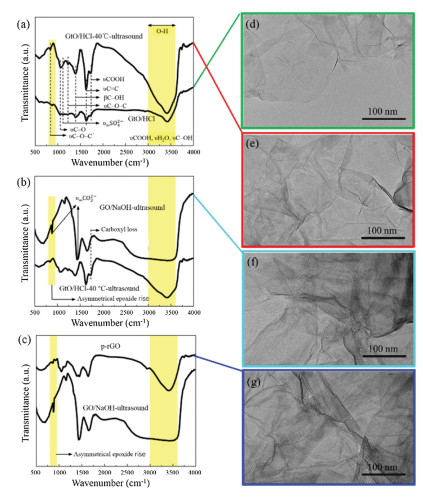 On the basis of the above results, the pore formation mechanism needs to be investigated. Therefore, we observed the variation of functional groups of the carbonaceous material during the whole experiment via FTIR (Figs. 3a–c). Fig. 3a presents a comparison of the FTIR spectra of GtO/HCl and GtO/HCl-40 ℃-ultrasound. Fig. 3b presents a comparison of the FTIR spectra of GtO/HCl-40 ℃-ultrasound and GO/NaOH-ultrasound. Fig. 3c presents a comparison of the FTIR spectra of GO/NaOH-ultrasound and p-rGO. Additionally, corresponding TEM images of GtO/HCl, GtO/HCl-40 ℃-ultrasound, GO/NaOH-ultrasound, and p-rGO are shown in Figs. 3d–g, respectively. The infrared spectrum of the synthesized GtO/HCl in Fig. 3a shows that the sample contains several oxygen-containing functional groups [30, 31]. These groups consist of hydroxyls (possible COOH and H2O contribution; C—OH, 3000–3600 cm-1), ketones and/or carboxyls (C=O, COOH, ~1700–1900 cm-1), sp2-hybridized C=C (in-plane stretching, ~1550–1650 cm-1), epoxides (symmetrical groups, C—O—C, other asymmetrical ether groups, C—O—C', ~1200–1300 and 800–900 cm-1) and sulfate ions (H2SO4, HSO4- or SO42-) inserted between layers when oxidized. Table S1 (Supporting information) shows the specific functional groups and their corresponding vibration frequency range. As shown in Fig. 3a, compared with GtO/HCl, the sulfate ions in GtO/HCl-40 ℃-ultrasound are completely lost, and the absorption intensity of carboxyl (1738 cm-1) and epoxide groups (~835 and 1225 cm-1) is remarkably increased. These results are attributed to the hydrolysis of sulfate and transformations of oxygen-containing functional groups [32].
