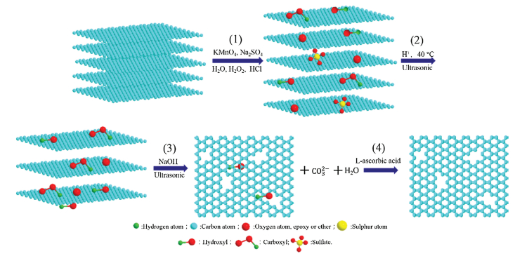 In this study, we report a novel approach to synthesize impurity-free PG with intrinsic porous structure through acidalkali etching-assisted sonication. The PG possesses an extremely high specific surface area of 2184 m2/g. It also contains micropores and mesopores simultaneously, and the average pore diameter is approximately 3 nm. Meanwhile, through transmission electron microscopy (TEM) and Fourier transform infrared spectroscopy (FTIR) analyses, the effects of acid, alkali, and ultrasound treatment on PG formation are elucidated. In an acidic solution, oxygen-containing functional groups are formed due to the hydrolysis of sulfate and continuous transformations of these functional groups on GO. In an alkali solution with the aid of ultrasound, PG is obtained due to the loss of carboxyl and epoxide groups.