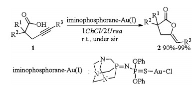 In 2014, Álvarez reported the first iminophosphorane-Au(Ⅰ) catalyzed cycloisomerisation of γ-alkynoic acids in DES (Scheme 1) [10]. Treatment of γ-alkynoic acids 1 with Au(Ⅰ) catalyst in 1ChCl/2Urea at room temperature under air afforded desired cycloisomerisation products 2 in excellent yields. Other DESs like 1ChCl/2glycerol (Gly), 1ChCl/2ethyleneglycol (EG) and 1ChCl/2lactic acid (Lac) were also efficient for the formation of products, but the eutectic mixture 1ChCl/2Urea enabled much higher activity of iminophosphorane-Au(Ⅰ) catalyst leading to quantitative conversion in only 15 min. This fact could be probably attributed to basic and more dipolar nature of 1ChCl/2Urea. Most importantly, this catalytic system remained active (90%-99%) after recycling up to four consecutive runs, without a notable decrease of the activity after each cycle. Thus, this reaction in DESs provided important contribution to green chemistry.