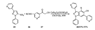 Magnetically separable graphene oxide anchored sulfonic acid (Fe3O4/GO/SO3H) nanoparticles catalyzed one-pot, three components reaction of 1-phenyl-3-(pyridin-3-yl)-1H-pyrazol-5-amine with 3-oxo-3-(pyridin-3-yl)propanenitrile and aldehydes in ChCl/Gly was applied for synthesis of 3, 6-di(pyridin-3-yl)-1H-pyrazolo [3, 4-b]pyridine-5-carbonitriles. As shown in Scheme 10, Subjection of amine 25, aldehydes 26 and nitrile 27 to CoFe2O4/GO/SO3H catalyzed one-pot reaction under microwave irradiation using ChCl/Gly as a green solvent gave corresponding products 28 in good to excellent yields [17].