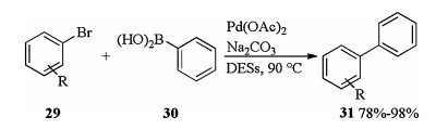 In 2006, König described Pd catalyzed Suzuki coupling of aryl halides with phenyl boronic acid in DESs [18]. Aryl bromides 29 was coupled with phenyl boronic acid 30 in different sugar/urea/ salt DESs at 90 ℃ using Pd(OAc)2 as a catalyst and Na2CO3 as a base to afford corresponding coupling products 31 in good to excellent yields (Scheme 11).