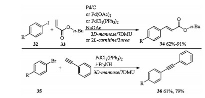 In 2009, the same research group reported Pd catalyzed Heck cross coupling and Sonogashira cross coupling in DESs [19]. Subjection of iodide 32 and n-butyl acrylate 33 to different Pd (Pd/C, Pd(OAc)2 or PdCl2(PPh3)2 catalyzed Heck cross-coupling in different DESs (3D-mannose/7DMU or 2L-carnitine/3urea) gave the desired coupling products 34 in 62%-91% yields. PdCl2(PPh3)2 catalyzed Sonogashira coupling of bromide 35 and phenyl acetylene in 3D-mannose/7DMU without copper co-catalyst formed corresponding coupling products 36 in moderate yields (Scheme 12).