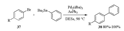 Pd catalyzed Stille alkylation of arylbromides and tributylphe-nylstannane in DESs was also studied [20]. When Pd2(dba)3/AsPh3 was applied as a catalyst, Stille alkylation of bromides 37 and tributylphenylstannane occurred in different DESs (6Lactose/ 3DMU/1NH4Cl, 5Mannitol/4DMU/1NH4Cl, 5Maltose/4DMU/1NH4Cl or 7Sorbitol/2DMU/1NH4Cl etc.) and afforded biphenyl products 38 in 80%-100% yields (Scheme 13).