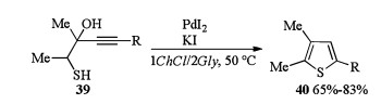 PdI2/KI-catalyzed heterocyclization in DESs was researched by Mancuso and Gabriele in 2016 (Scheme 14) [21]. In the presence of PdI2 and KI, heterocyclization of 1-mercapto-3-yn-2-ols 39 proceeded smoothly in 1ChCl/2Gly and led to corresponding thiophenes 40 in moderate to good yields. After extraction of the thiophene products with hexane or Et2O, the DES/catalytic system could be easily recovered and reused for several times without appreciable loss of activity.