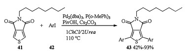 In 2017, Farinola studied the first Pd-catalyzed thiophene-aryl coupling reaction in DESs (Scheme 15). When Pd2(dba)3/P(o-MePh)3 was applied as a catalyst, PivOH was used as an additive and Cs2CO3 was applied as a base, direct thiophene-aryl coupling of 5-octylthieno[3, 4-c]pyrrole-4, 6-dione 41 with a series of function-alized aryl iodides 42 via C-H bond activation occurred in DES (1ChCl/2Urea) and gave products 43 in 42%-93% yields. Pd and ligand were found to be the key for successful implementation of this thiophene-aryl coupling. PdCl2(CH3CN)2, Pd(OAc)2, and Pd (PPh3)4 were found to be much less effective than the Herrmann-Beller catalyst, leading to low yields of 43, while Pd2(dba)3 and PdCl2(PPh3)2 shew higher efficiencies, affording 43 in 82% and 55% yields, respectively. Ligand P(o-MeOPh)3 afforded 43 in 82% yield, whereas Low yield (24%) were obtained in the presence of less electron-rich ligand P(o-MePh)3. When less hindered PPh3 was used, the desired product was obtained in 55% yield. These results suggested that electron donating group (MeO) in P(o-MeOPh)3 is beneficial for a smooth reaction course, probably due to its capacity to increase the electron density and the stability of the Pd complex in the reaction media [22].