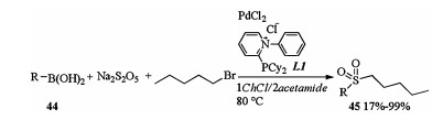 In 2017, Ramón described DES as a green solvent for the Pd catalyzed C-S Bond Formation [23]. When PdCl2/phosphine L1 was applied as a catalyst and sodium metabisulfite was used as SO2 source, the sulfonylation reaction of boronic acids 44 and subsequent alkylation of the sulfinate salt with pentyl bromide proceeded smoothly in 1ChCl/2acetamide in one pot manner and afforded corresponding products 45 in moderate to excellent yields (Scheme 16). The catalytic system could be reused for three times without decrease in the yield of the reaction.